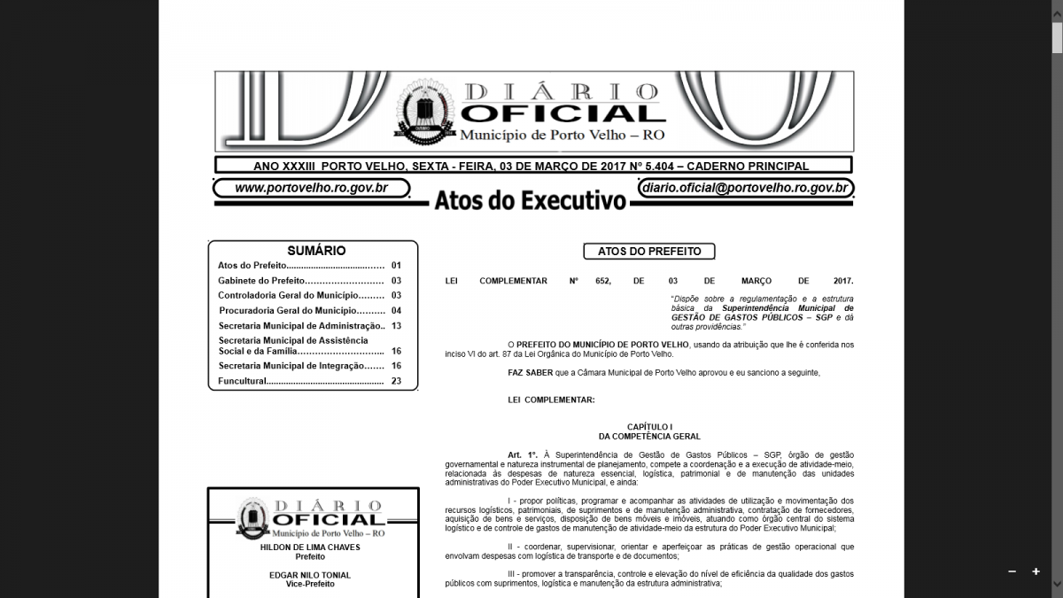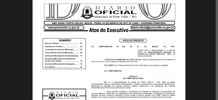 Desde terça-feira (1º), o Diário Oficial do Município de Porto Velho está circulando com novo visual Com as mudanças que foram feitas, o DOM, que pode ser acessado no Portal Transparência, no site da prefeitura (http://transparencia.portovelho.ro.gov.br/), tornou-se muito mais prático na hora de se pesquisar leis, portarias e decretos do Executivo municipal.