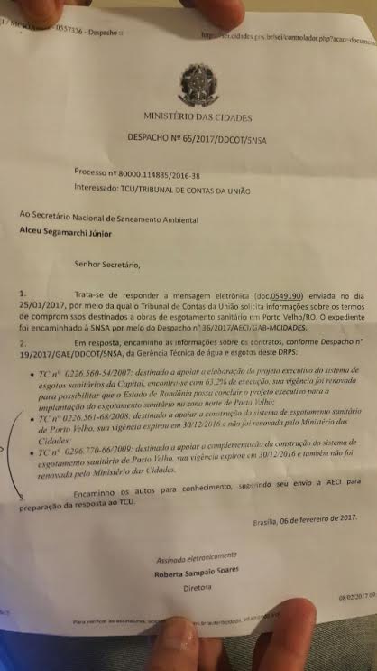 Durante a audiência no TCU, o ministro Bruno Dantas apresentou um documento datado de 6 de fevereiro de 2017, assinado pela diretora do Ministério das Cidades, Roberta Sampaio Soares, confirmando que a “vigência do convênio expirou no dia 30 de dezembro de 2016 e não foi renovado pelo Ministério das Cidades”.