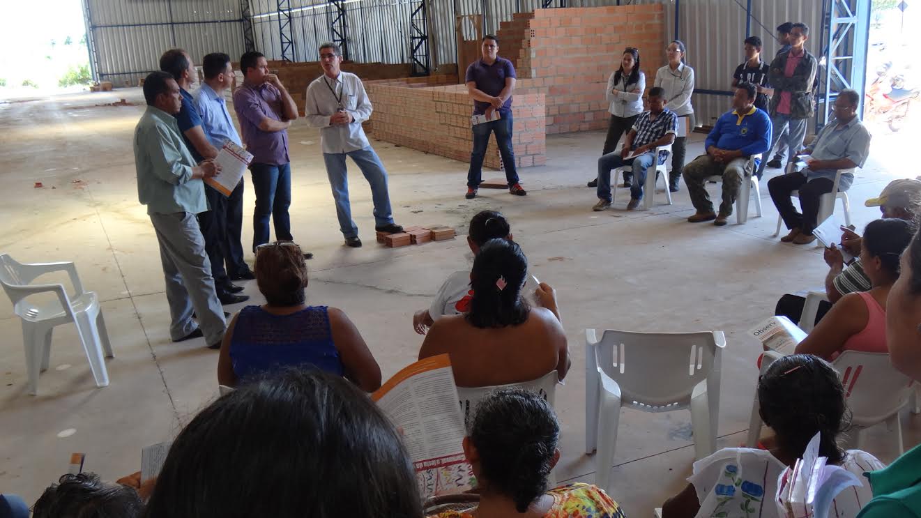 A conclusão do barracão da feira livre de Nova Mutum Paraná, doado pelo consórcio Energia Sustentável do Brasil (ESBR), foi tema de reunião entre os produtores rurais e feirantes, com o subsecretário municipal de Agricultura e Abastecimento (Semagric), Francisco Evaldo de Lima, o subsecretário municipal de Desenvolvimento Socioeconômico e Turismo (Semdestur), Júlio César Siqueira, com o gerente de Meio Ambiente da ESBR, Veríssimo Neto e os vereadores, Jurandir Bengala e pastor Edésio Fernandes, entre outros.