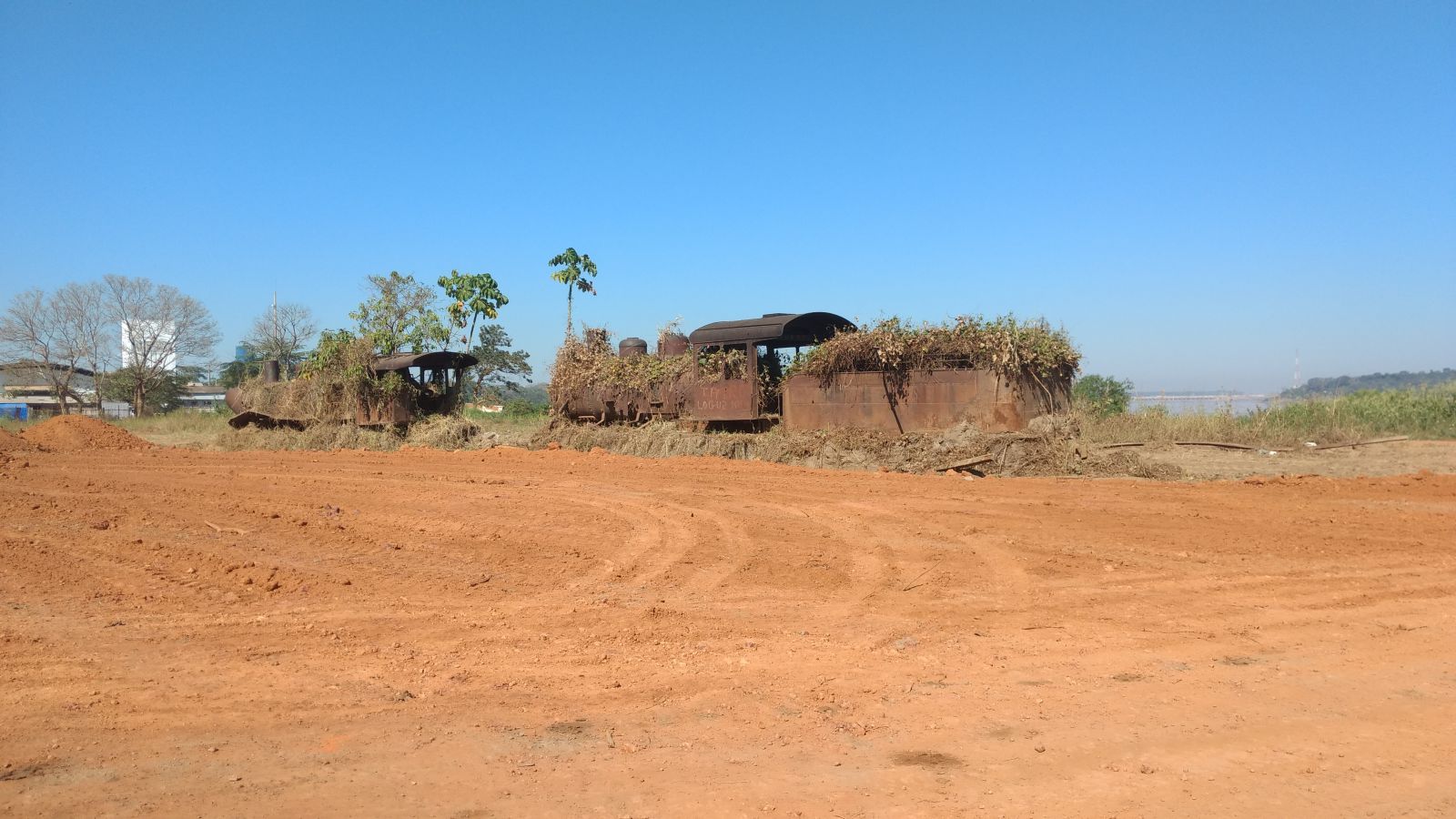 Trabalhadores se distribuem entre os serviços de capina, roçagem e alguns tratores estão retirando o aterro formado pela cheia histórica do rio Madeira, ocorrida em 2014. Todos os itens que estão no local, como partes de vagões da locomotiva, e de outros maquinários da lendária Estrada de Ferro estão sendo preservados.