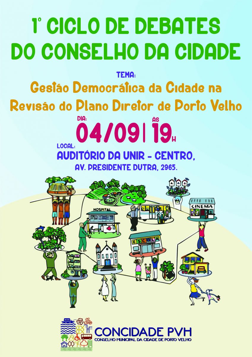 "Gestão Democrática da Cidade na Revisão do Plano Diretor de Porto Velho" é o tema do 1º Ciclo de Debates promovido pelo Conselho Municipal da Cidade, que vai acontecer no próximo dia quatro de setembro, a partir das 19h, no auditório da Unir centro, à avenida Presidente Dutra, 2965, na região central da capital.