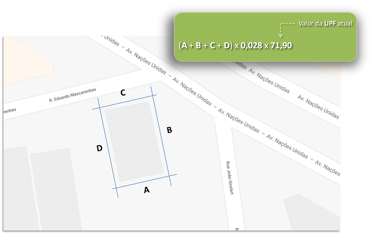 O perímetro é calculado pela soma das medições do lote conforme ilustrado abaixo: