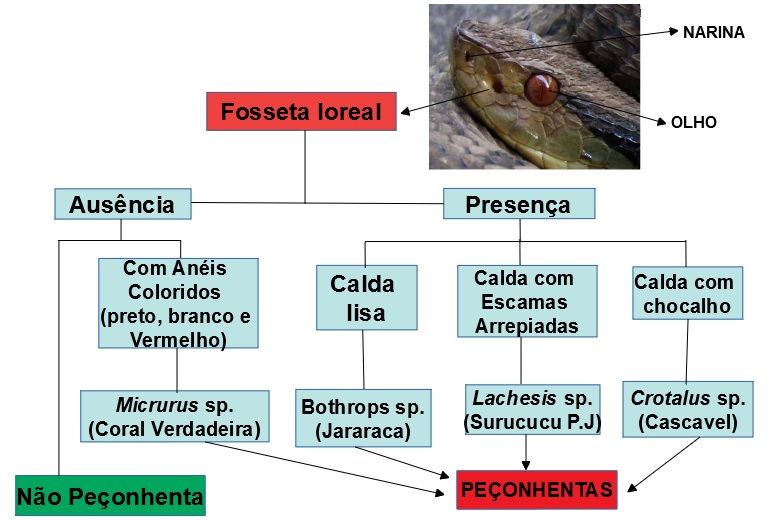 OBS: Fosseta loreal é um órgão termorreceptor (capta o calor do corpo de outros animais), presente somente nas serpentes peçonhentas, com exceção das corais verdadeiras que são peçonhentas e não possuem fosseta loreal.