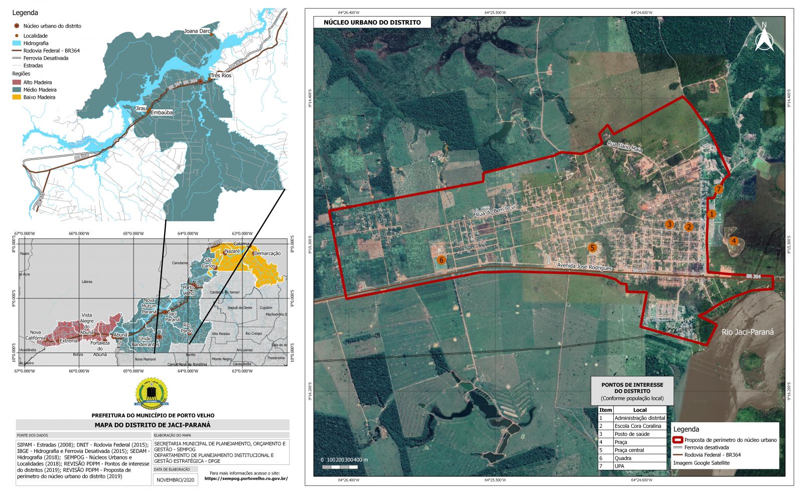 O distrito limita-se partindo da foz do Rio Caracol no Rio Madeira, sobe o Rio Caracol até o limite da Floresta Nacional do Bom Futuro (exclusive); segue por este limite até o Rio Branco; sobe por este até o Rio Pardo; sobe por este até o Paralelo 9º 50’ 00’’; segue por este Paralelo até o Igarapé Trindade; desce por este até o Rio Jaci-Paraná; sobe por este até o Rio Formoso; sobe por este até o Paralelo 10° 00’00’’; segue por este Paralelo até o Rio Francisco; desce por este até o Igarapé do contra; sobe por este até a foz do Igarapé sem denominação afluente de sua margem esquerda com coordenadas S 9° 37’ 38’’ W 64º 37’ 37’’, sobe por este até a sua Cabeceira com coordenadas DE s 9º 31’41’’ w 64º 40’ 18’’; deste ponto, segue em linha reta com distancia de 2.700 metros até a Cabeceira do Igarapé Caiçara, cuja coordenada é de S 9º 32’ 44’’ W 64º 41’ 27’’; deste ponto, desce o Igarapé Caiçara até o Rio Madeira; ; desce por este até o Rio São Lourenço; sobe por este até o Divisor de Águas dos Rios Madeira/Ituxi; segue por este Divisor até a Cabeceira do Rio Cancão; desce por este até o Rio Madeira; sobe por este até a foz do Rio Caracol, ponto inicial. Em sua região territorial possui as localidades de Embaúba, Jirau, Joana D'arc,Três Rios, até o momento (19/11/2020). |