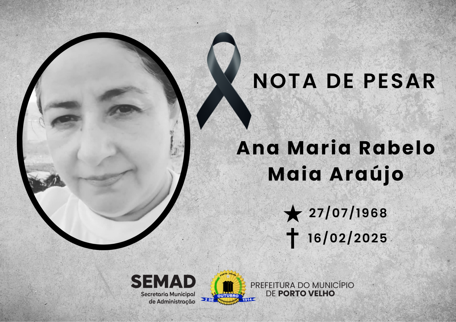 A Secretaria Municipal de Administração expressa seu imenso pesar pelo falecimento da servidora Ana Maria Rabelo Maia Araújo.