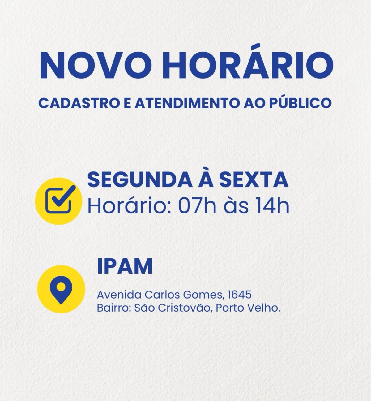Reforçamos que todos os serviços de cadastro e atendimento ao público estarão disponíveis exclusivamente dentro do novo horário.