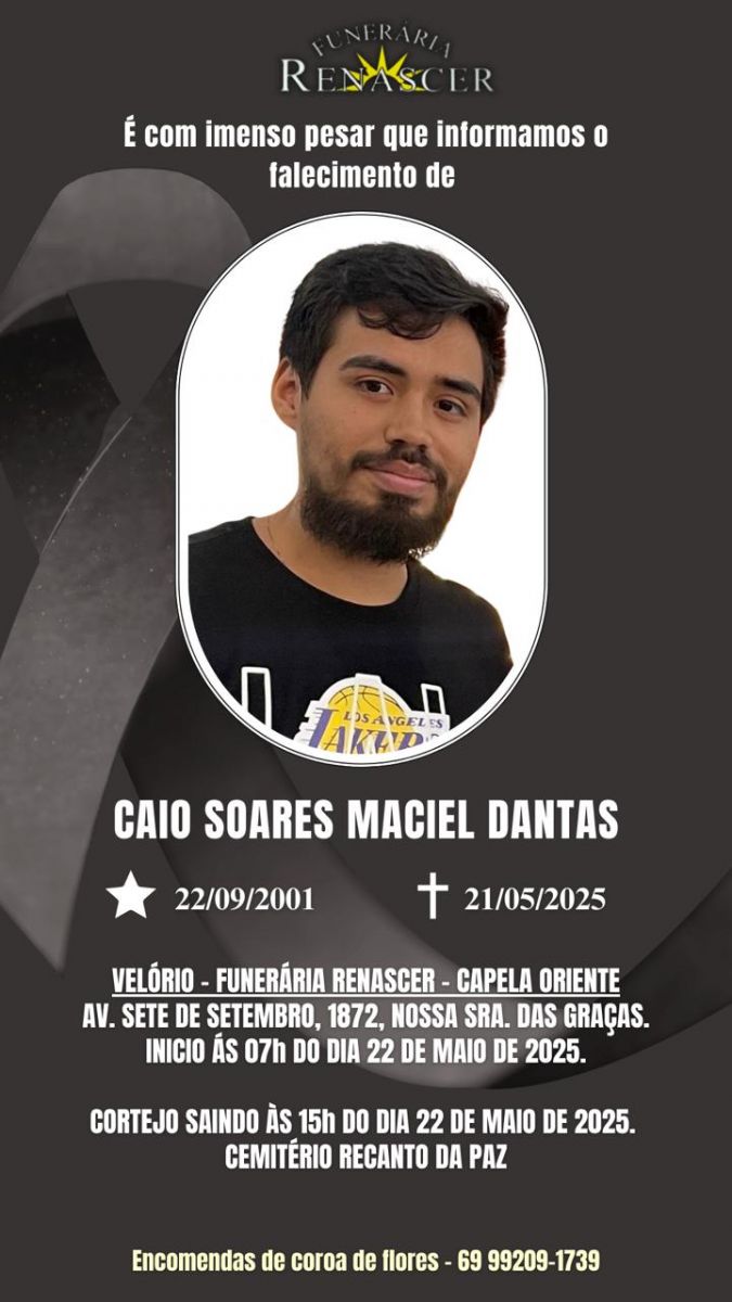 A Superintendência Municipal de Gastos Públicos (SGP) de Porto Velho manifesta, com profundo pesar, o falecimento de Caio Soares Maciel Dantas, ocorrido no dia 21 de maio de 2025, aos 23 anos.