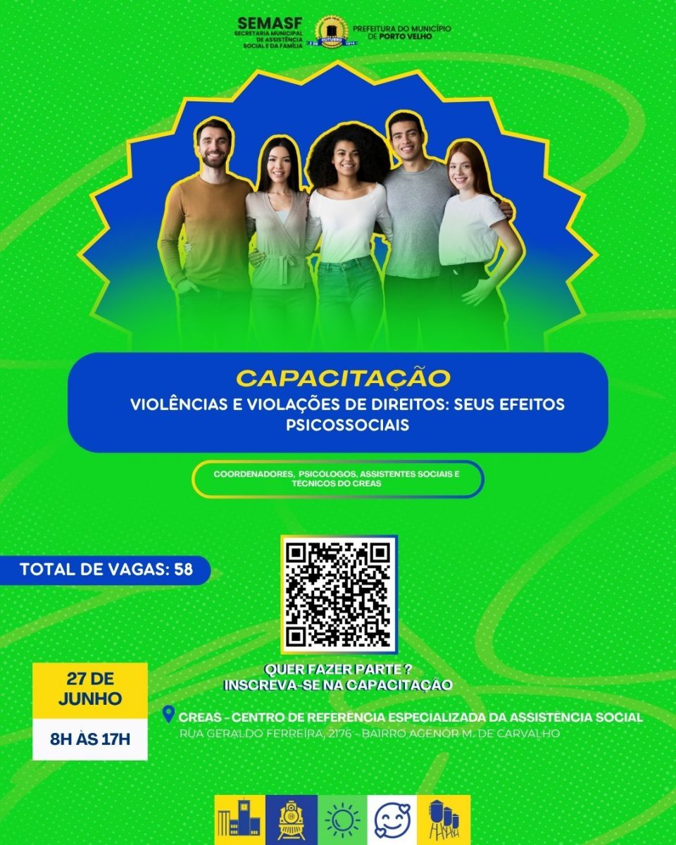 A Secretaria Municipal de Assistência Social e da Família (Semasf), da Prefeitura de Porto Velho, realiza no dia 27 de junho de 2025, o curso “Violências e Violações de Direitos: Seus Efeitos Psicossociais”, direcionado aos técnicos, assistentes sociais, psicólogos e coordenadores do Centro de Referência de Assistência Social (Creas) da secretaria. O curso será realizado das 8h às 17h, na sede do Creas, à rua Geraldo Ferreira, 2176, bairro Agenor de Carvalho.