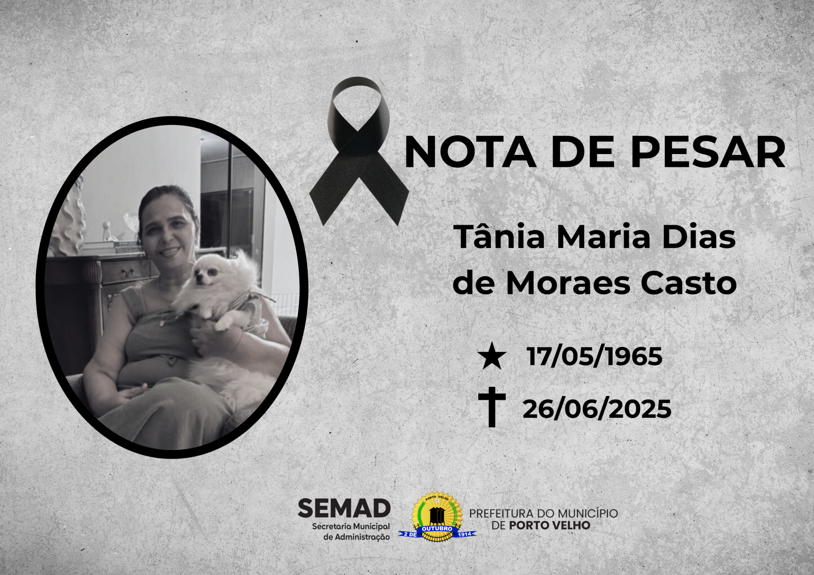 A Secretaria Municipal de Administração manifesta, com profundo pesar, o falecimento da servidora Tânia Maria Dias de Morais Casto, ocorrido no dia 26 de junho de 2025.